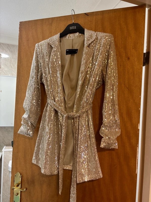 Featuring a dazzling gold sequin finish, this ruched sleeve blazer adds a touch of glamour. Perfect for special occasions, it boasts a tie belt for a customizable fit.