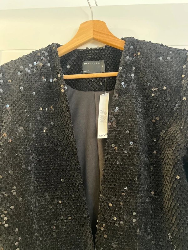 The ASOS Design Sequin Collarless Blazer in Black is available in sizes M.