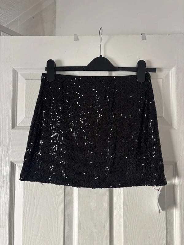 The ASOS Design Black Sequin Mini Skirt is available in sizes M.