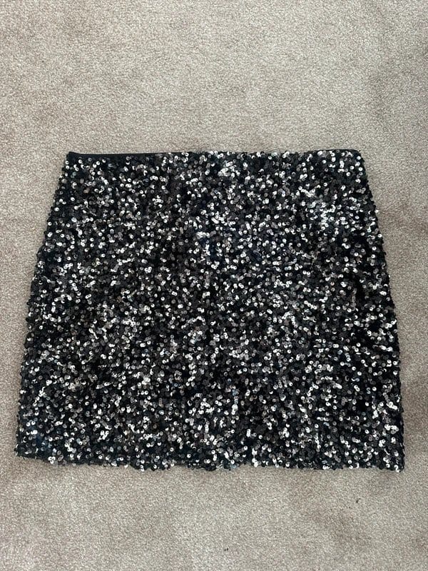 “Pair with a simple black top and silver high heels for a glamorous evening look.”