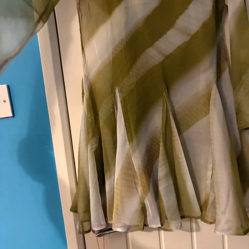 Elegant long sleeve mini dress with mesh sleeves and godet style mesh bottom. The green stripe pattern adds a vibrant touch to this versatile piece.