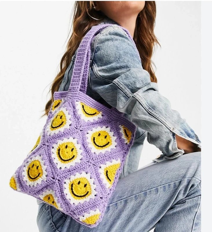 Charming Lilac Crochet Shopper Bag — perfect for casual outings. Designed with crochet details, smiley face pattern, and large capacity. Ideal for everyday use.