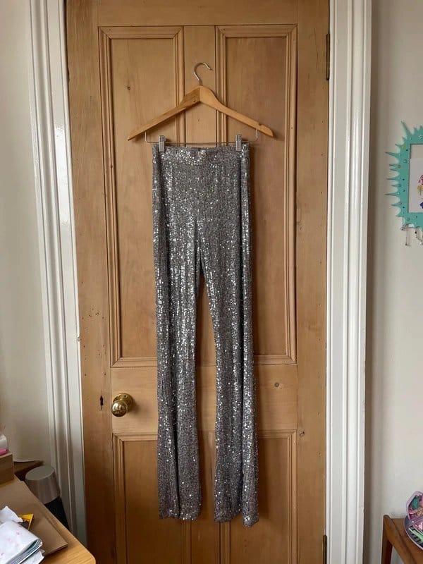 The ASOS Design Silver Sequin Flared Trousers is available in sizes S.