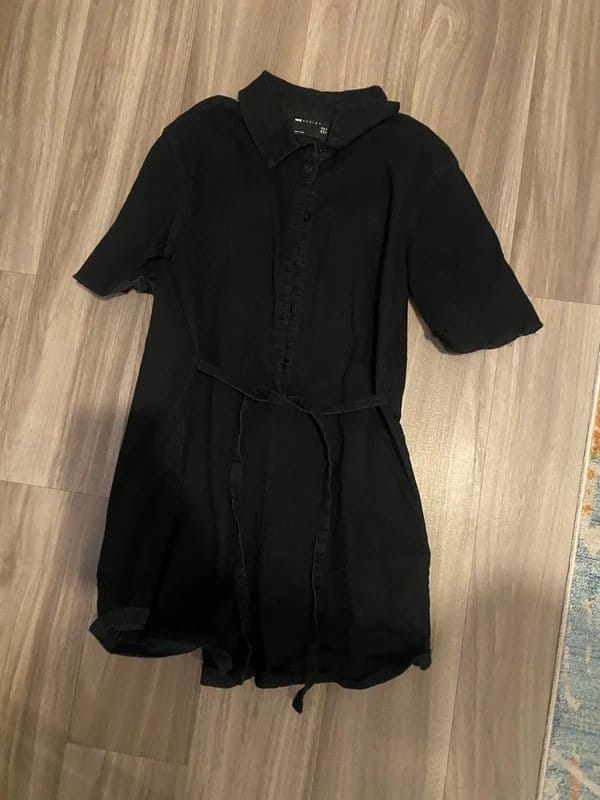 See all outfit ideasStylish black denim jumpsuit with a waist string and shorts for a casual look. Perfect for everyday wear.