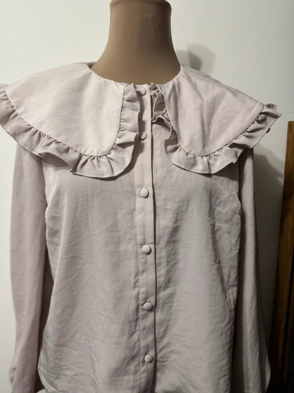 Soft touch lilac Peter Pan collar shirt with a vintage style. This long sleeve blouse features a ruffled collar and a satin finish. Crafted from lightweight fabric, it offers a feminine and cottagecore aesthetic. Perfect for casual and smart-casual occasions.