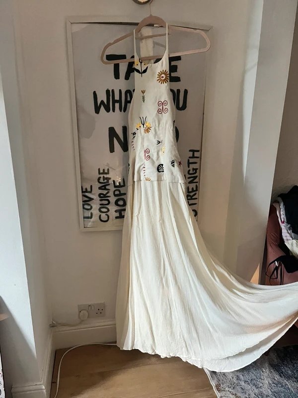 A stunning cream dress perfect for casual or event wear. It features a halterneck style, floral embroidery, and cut-out panels. The zip-side fastening ensures a snug fit, while the fully lined skirt adds comfort.