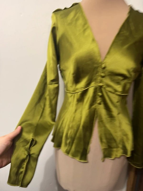 Crafted with olive green, long sleeves, and a V-neck, this top features a satin-style fabric that is glossy, drapey, and silky-smooth. Ideal for those who appreciate elegant and modern styling.