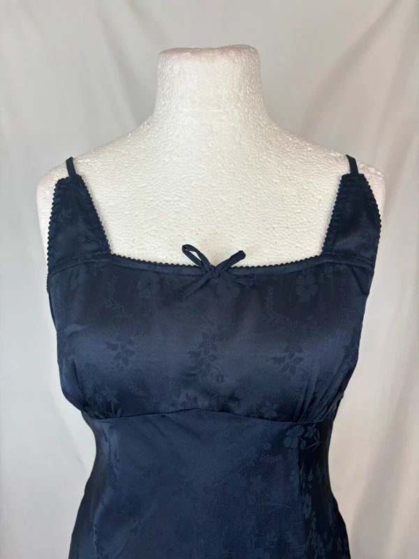 Lovely navy slip-style midi dress in a soft satin-feel fabric with a subtle woven floral pattern. It has adjustable straps and a small bow detail at the neckline, giving it that classic 90s lingerie-inspired slip dress appeal. Lightweight and easy to wear, with a soft feminine silhouette that works beautifully dressed up or layered.