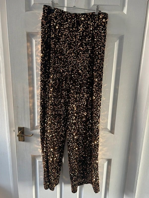 Luxurious black velvet trousers adorned with gold/copper sequins. The elastic waist ensures a comfortable fit. Ideal for evening events or special occasions.
