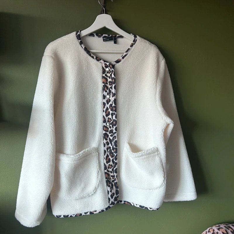 This white fleece jacket features a leopard print trim along the neckline and hem, giving it a stylish and trendy look. The lightweight material ensures comfort while the relaxed fit makes it perfect for casual outings.