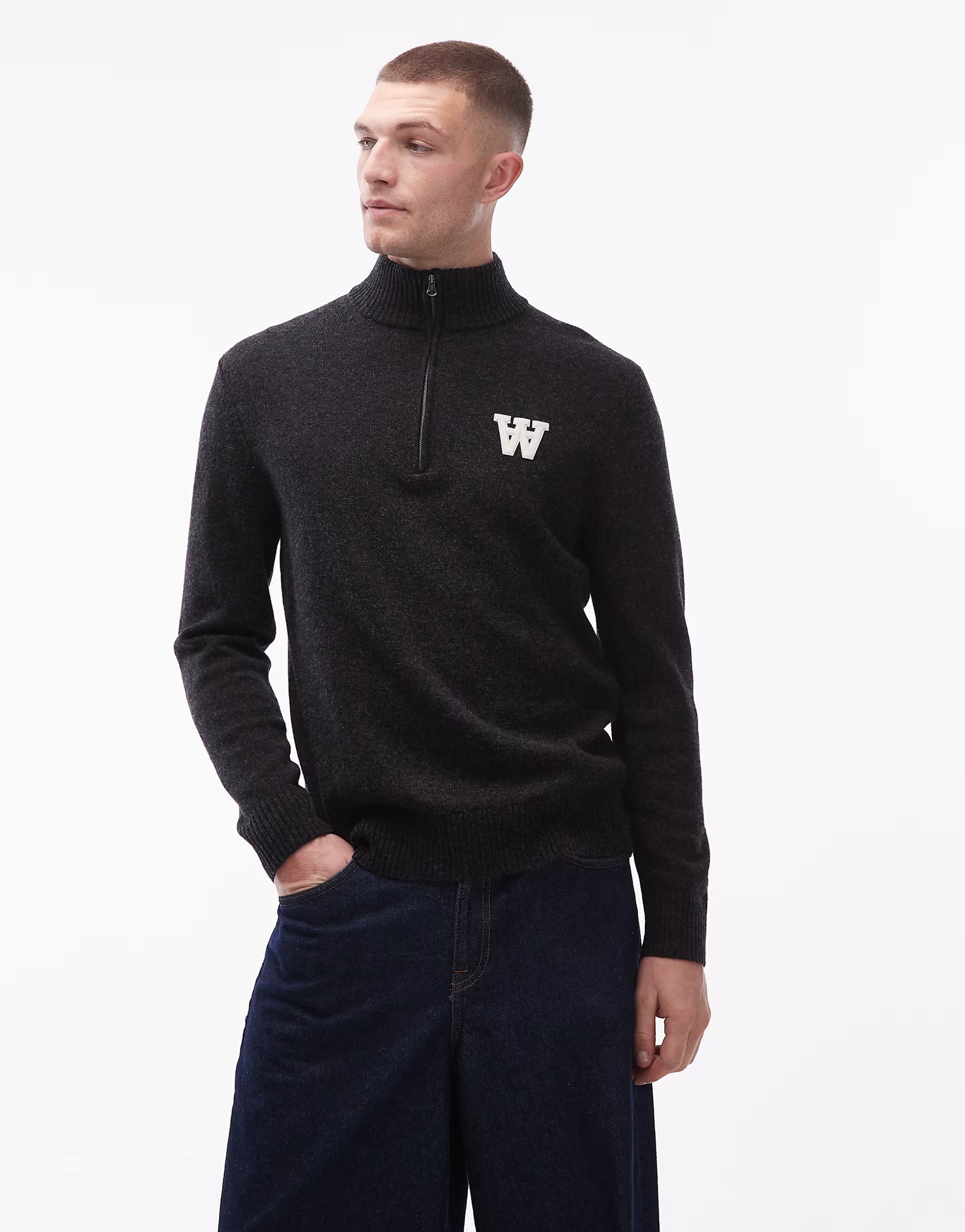 This black jumper by Double A by Wood Wood is crafted from 100% wool, offering a classic and timeless appeal. The quarter-zip feature adds a modern twist, while the logo detail adds a signature touch.