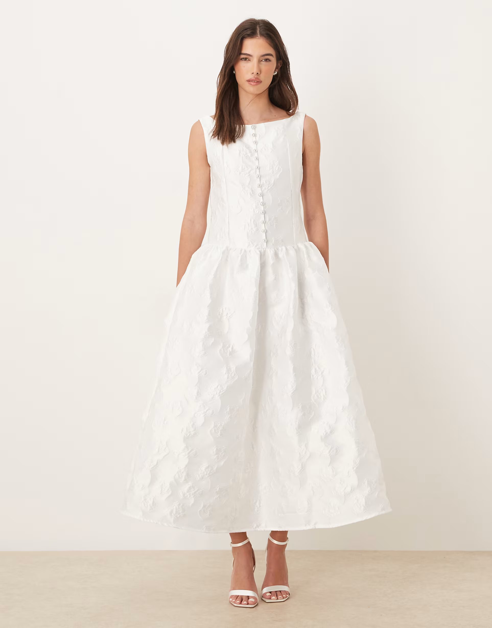 The ASOS Dream Sister Jane Ivory Boat Neck Pearl Button Maxi Dress is made from jacquard.