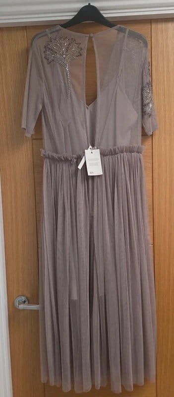The ASOS Light Grey Beaded Embellished Dress is available in sizes M.
