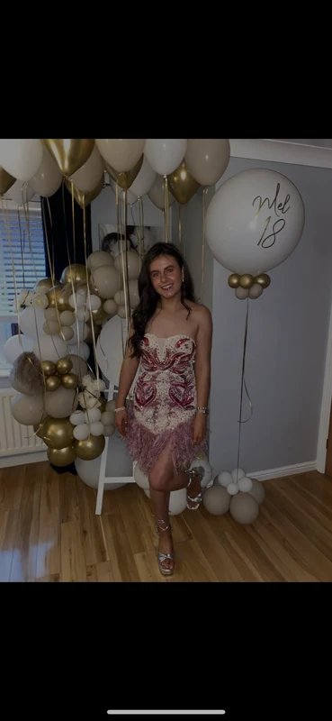 This pink embellished dress from ASOS is perfect for special occasions. The dress features a strapless neckline, long sleeves, and a fitted silhouette. Crafted from lightweight fabric with embellishments like sequins and beading, it adds a touch of glamour. Ideal for evening events and parties, this dress is sure to turn heads.
