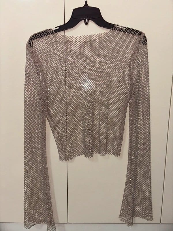 See all outfit ideasThis beige mesh embellished crop top by ASOS features a flared sleeve design and sparkly embellishments for a glamorous look. Ideal for evening events or casual outings.