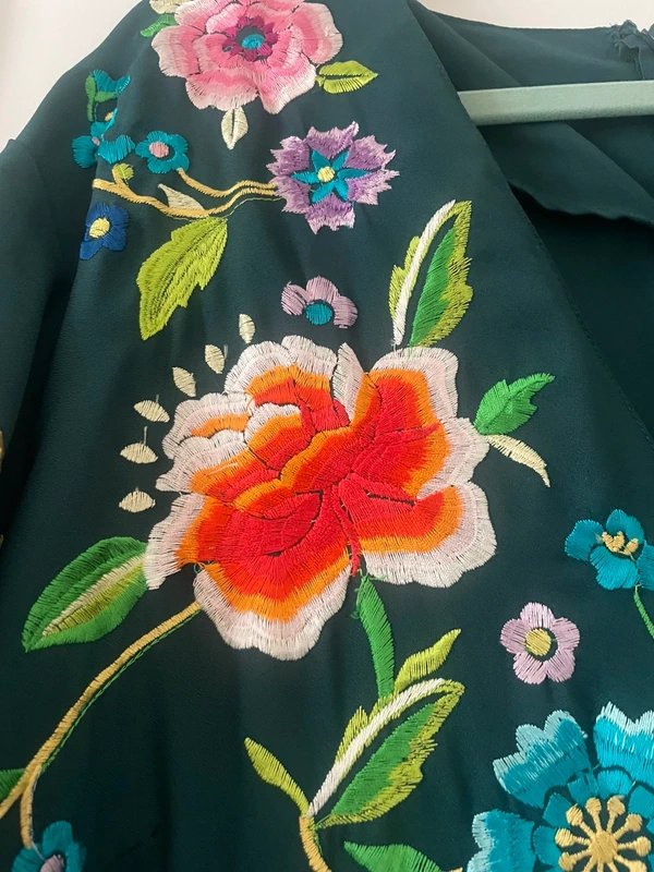 Stunning dark green dress. Lovely colours. Lined pleated skirt and zip back. Bell embroidered sleeves so very flattering. Ideal for wedding, party, prom….
