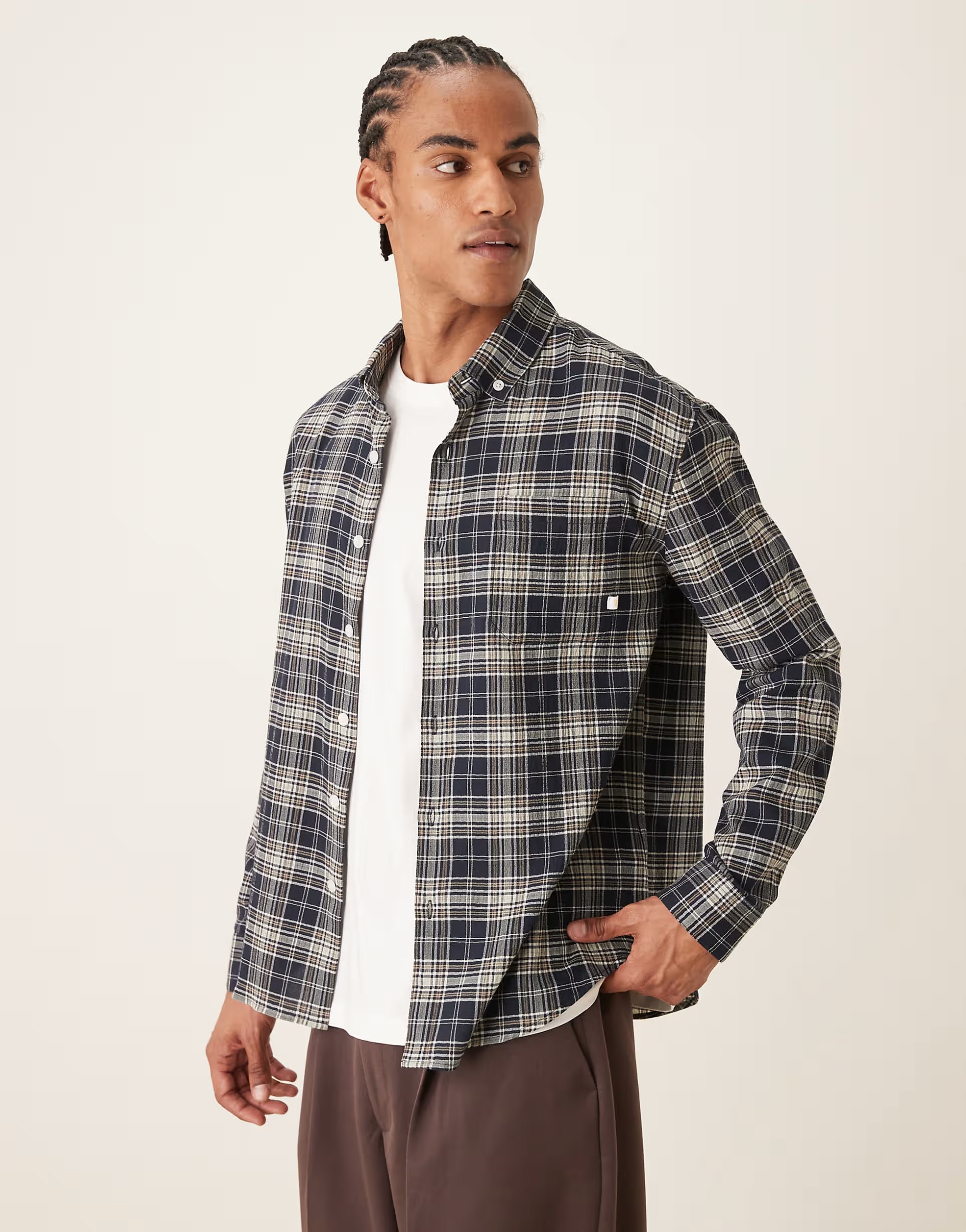 The ASOS Farah Sands Long Sleeve Check Shirt in Navy is ideal for casual, smart-casual.