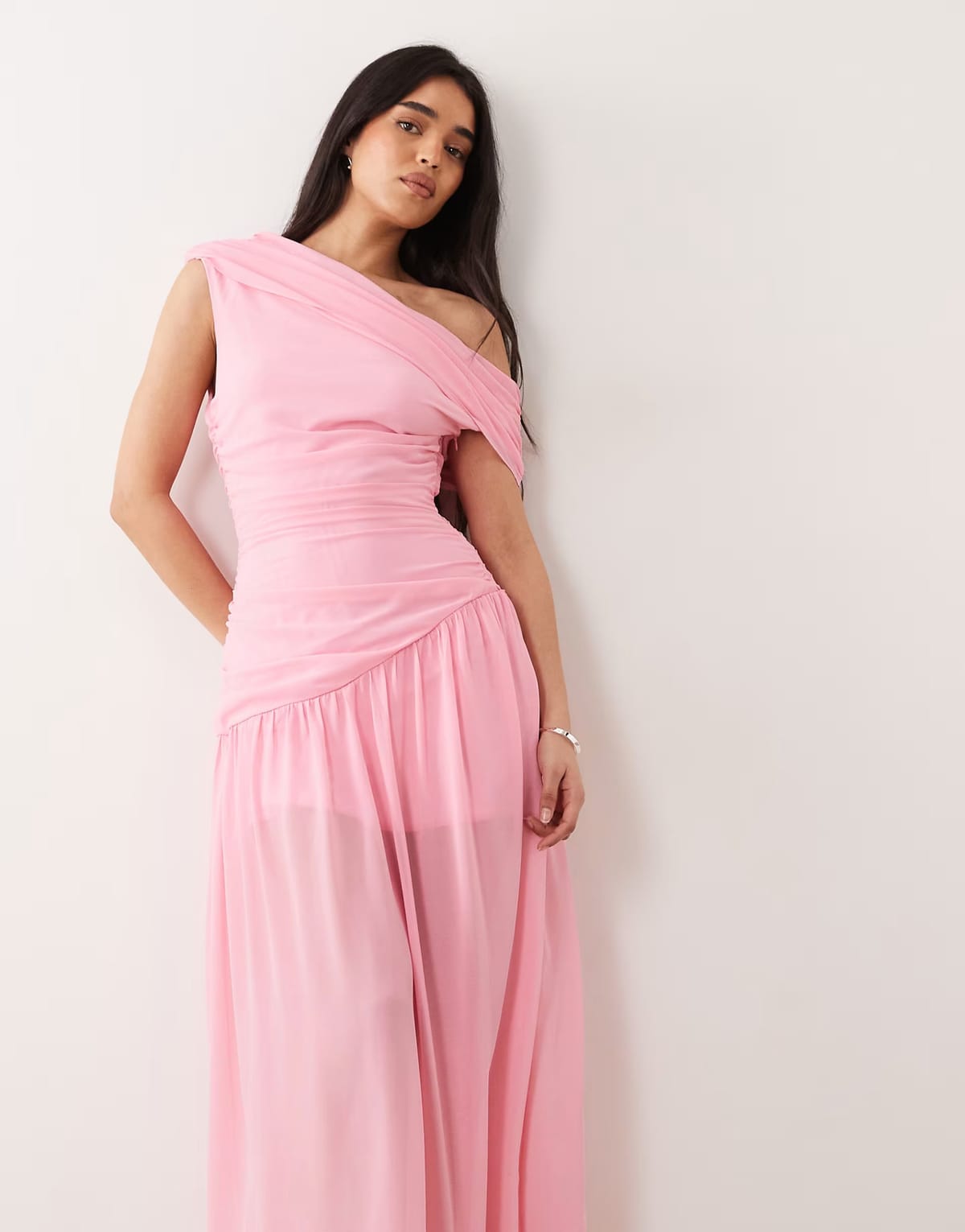 See all outfit ideasThis pink chiffon off-shoulder maxi dress features an asymmetric hem and gathered sheer hem. Ideal for evening events or special occasions.