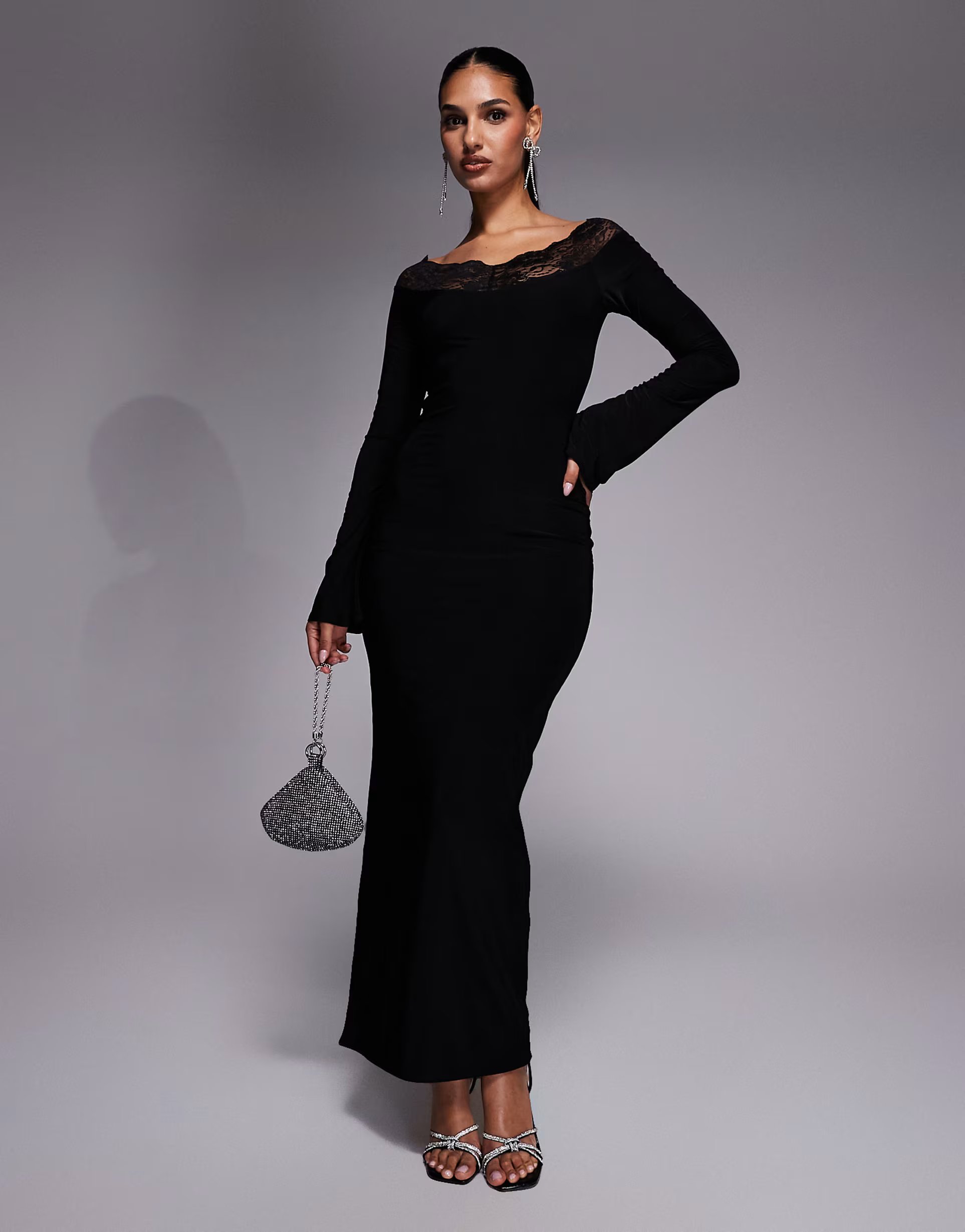 This maxi dress from ASOS features slinky lace trim and a bardot neckline for an elegant touch. The flare sleeves add a touch of drama, perfect for special occasions.