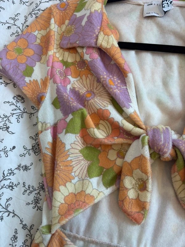 Vibrant floral jumpsuit with tie top and cut out stomach. Crafted from toweling material, this jumpsuit features a chic cut-out design and a tie top for a unique look. Perfect for casual outings or summer events.