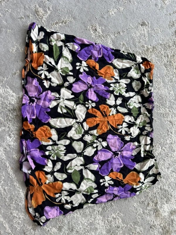 This stretchy floral midi skirt is perfect for a casual day out. Its vibrant purple and orange print adds a pop of color, making it a versatile piece for any wardrobe.