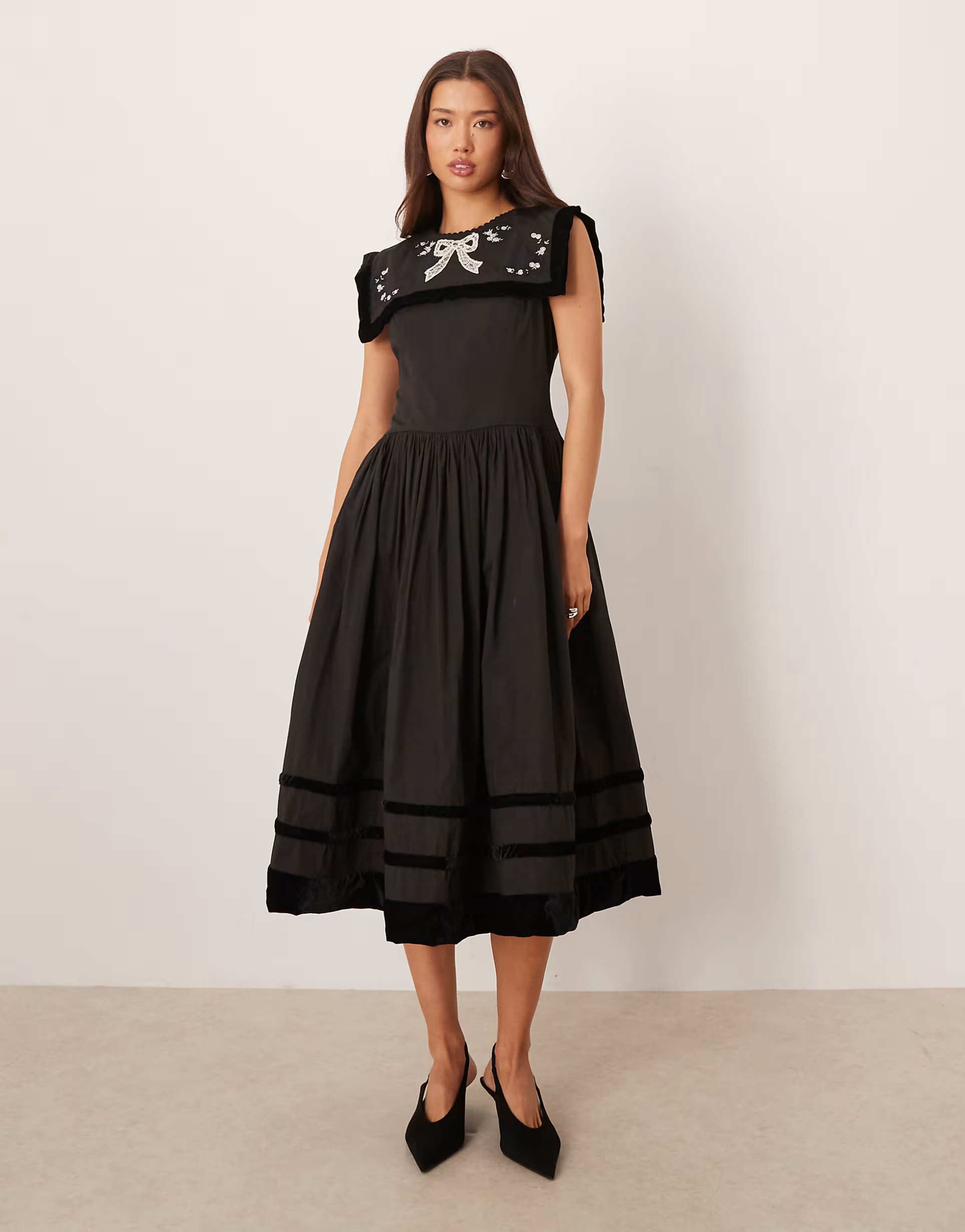 The ASOS Embroidered Bib Detail Midi Dress in Black is made from poplin, velvet.