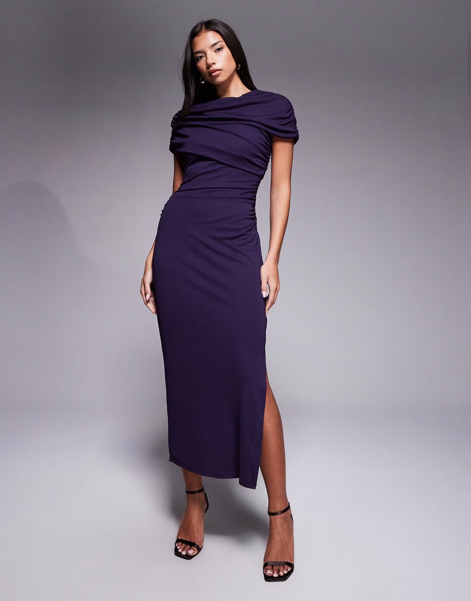 The ASOS Forever New Cape Shoulder Midi Dress in Dark Purple is ideal for evening, party, date-night.