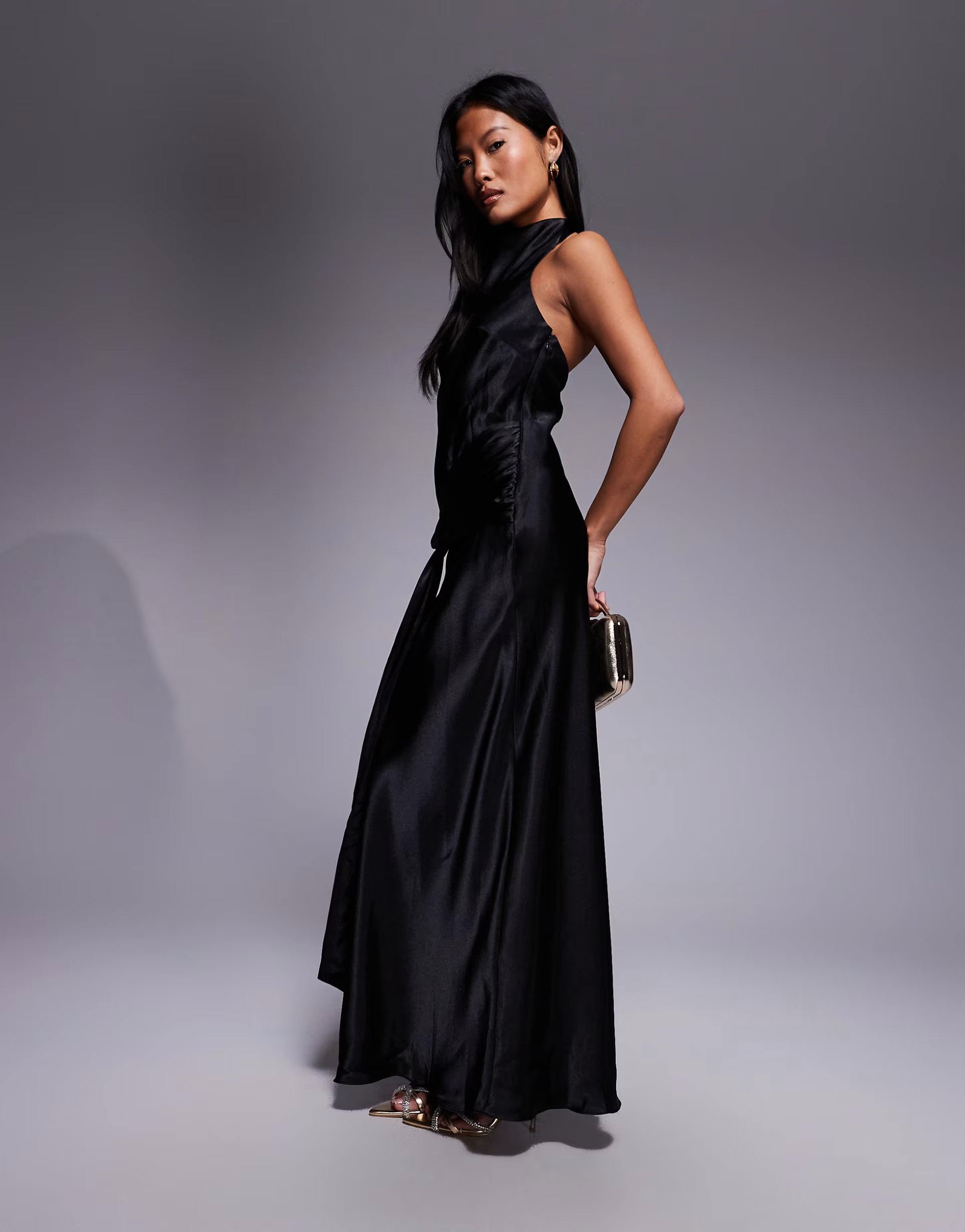 The ASOS Petite Satin Halter Maxi Dress in Black is made from satin.