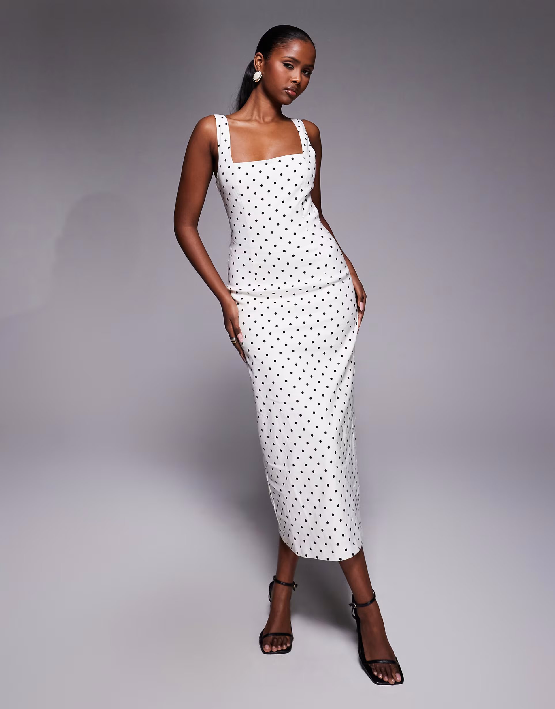 The ASOS Forever New Polka Dot Midi Dress in White is made from linen, stretch.
