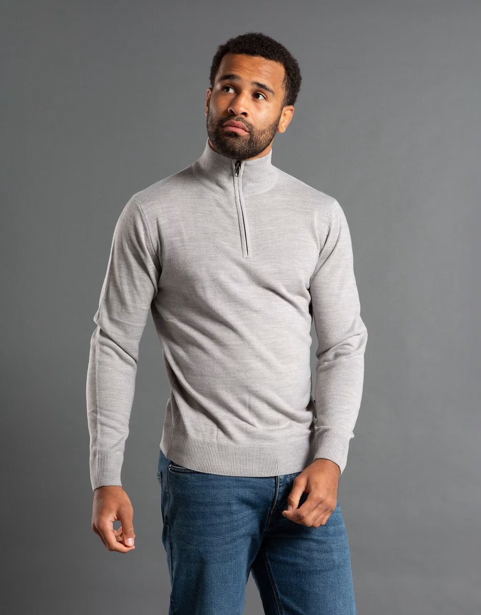 Light Grey Knitted Jumper — a versatile piece for casual and smart-casual occasions. Designed with light grey, 1/2 zip, long sleeve, crew neck, knitted. Features comfortable, business-casual style for a versatile look.