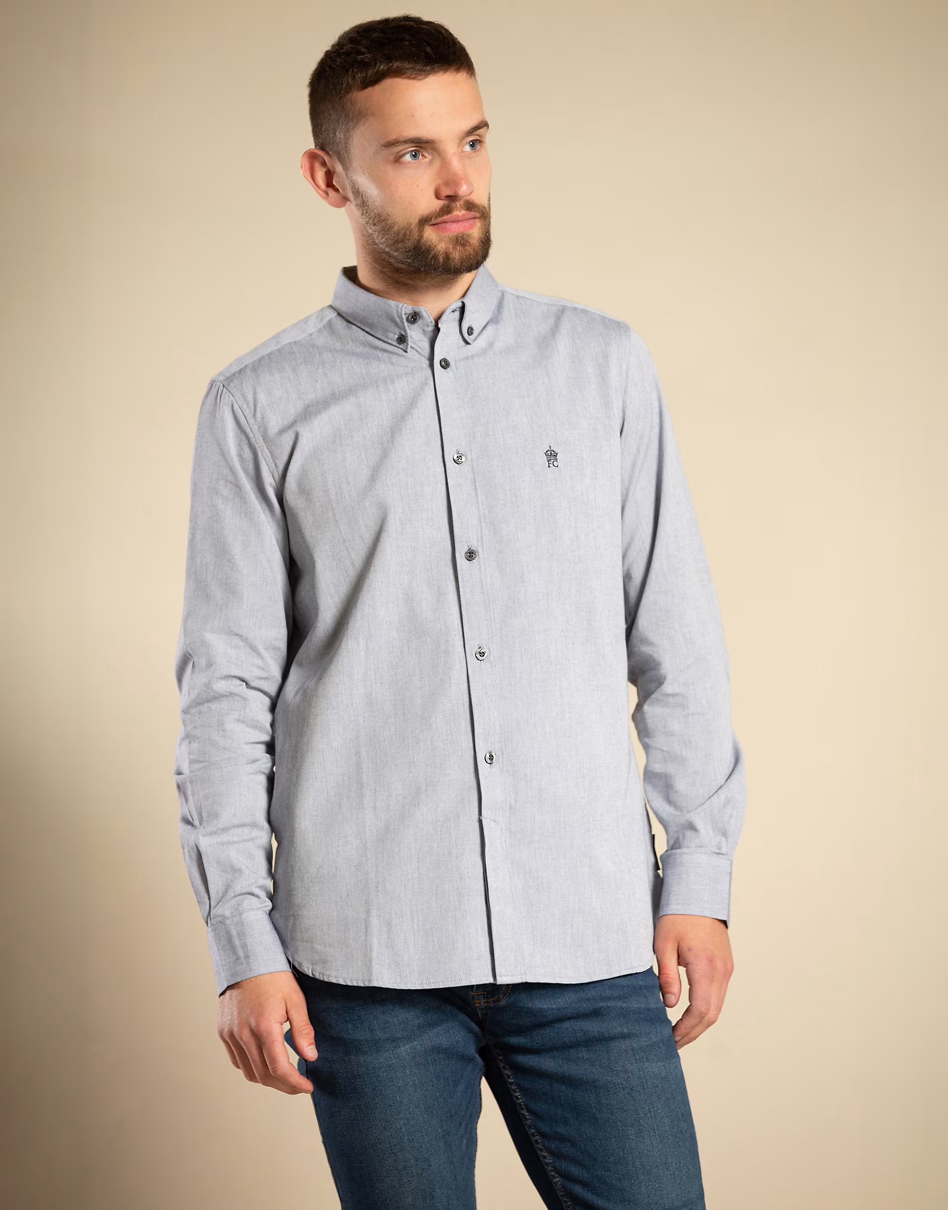 Stylish bright blue cotton long sleeve oxford shirt with a classic button-down front and pointed collar. Features a subtle twill weave for a textured look and a small embroidered logo on the left chest. Perfect for smart-casual occasions.