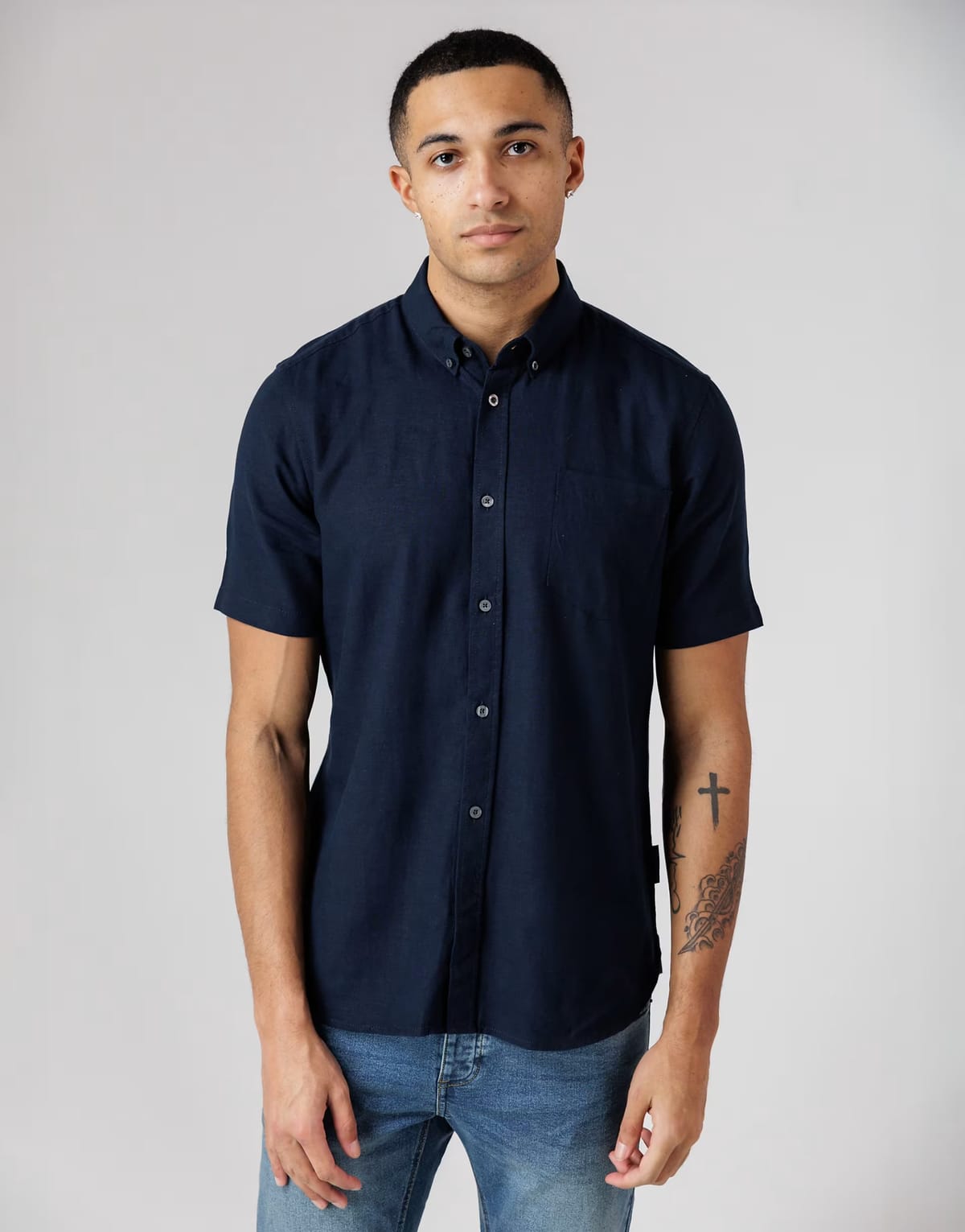 Stylish navy linen blend short sleeve shirt from ASOS. Featuring a pointed collar and a single chest pocket, this shirt offers a relaxed fit for everyday comfort. Perfect for casual outings or smart-casual ensembles.