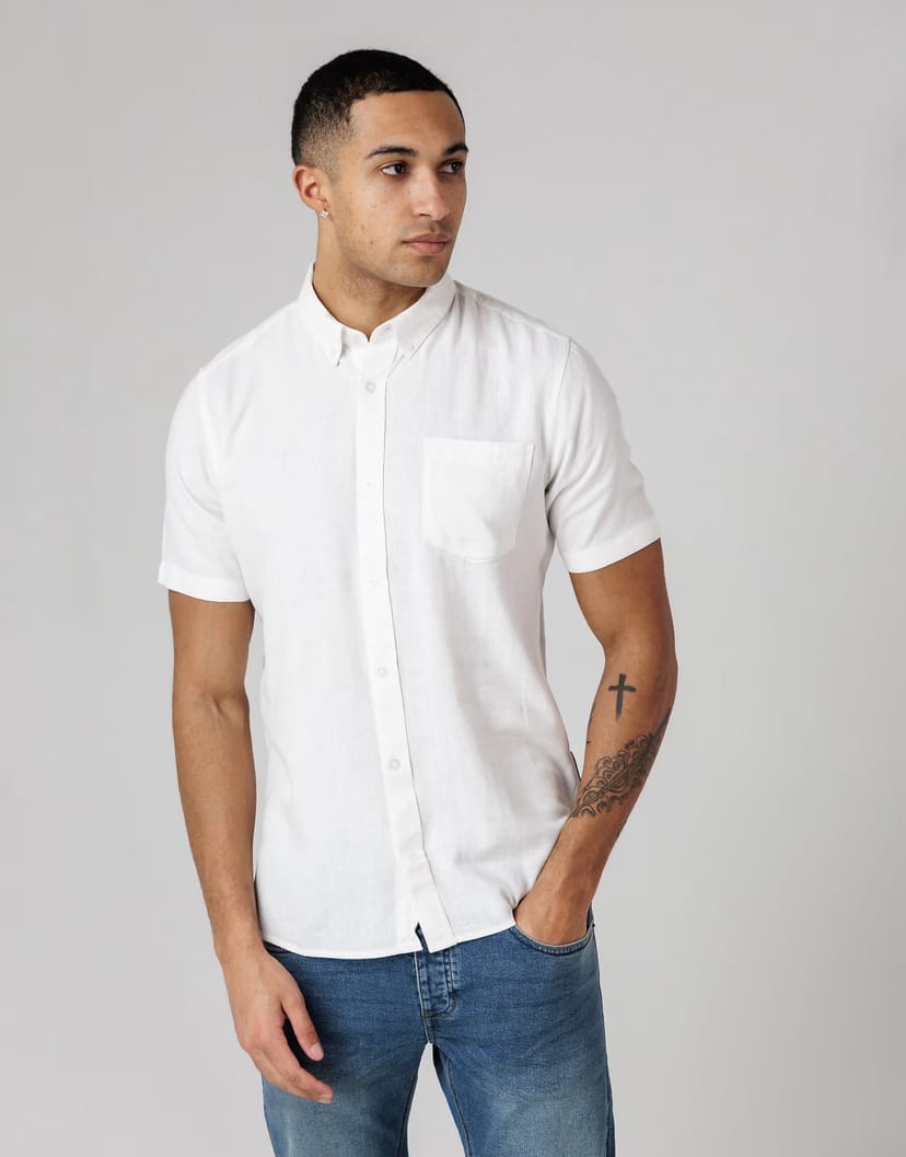 Classic short-sleeve shirt in white linen blend from ASOS. Features a button-down front, collared neckline, and a single chest pocket. Perfect for casual and smart-casual occasions.