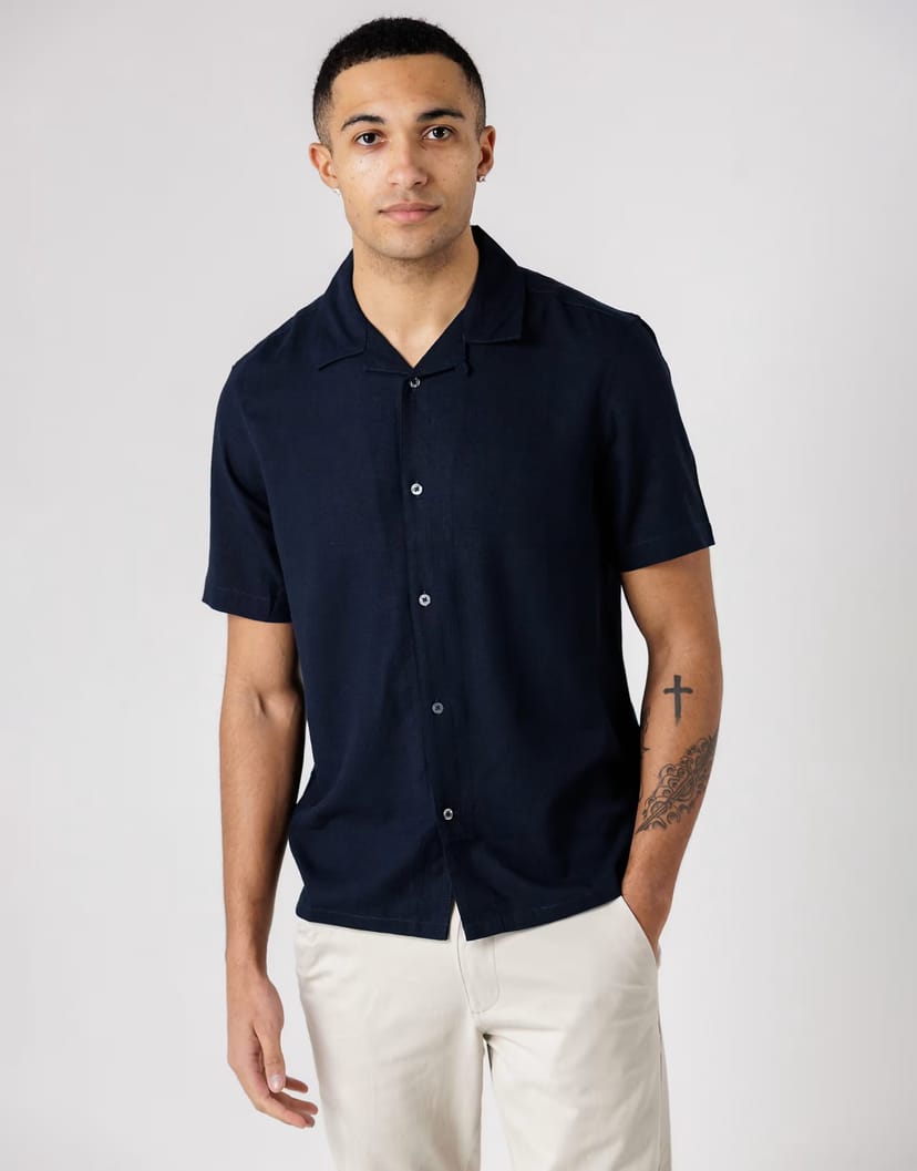 Stylish navy linen blend short sleeve shirt with a revere collar and button-down front. Perfect for casual and smart-casual occasions.