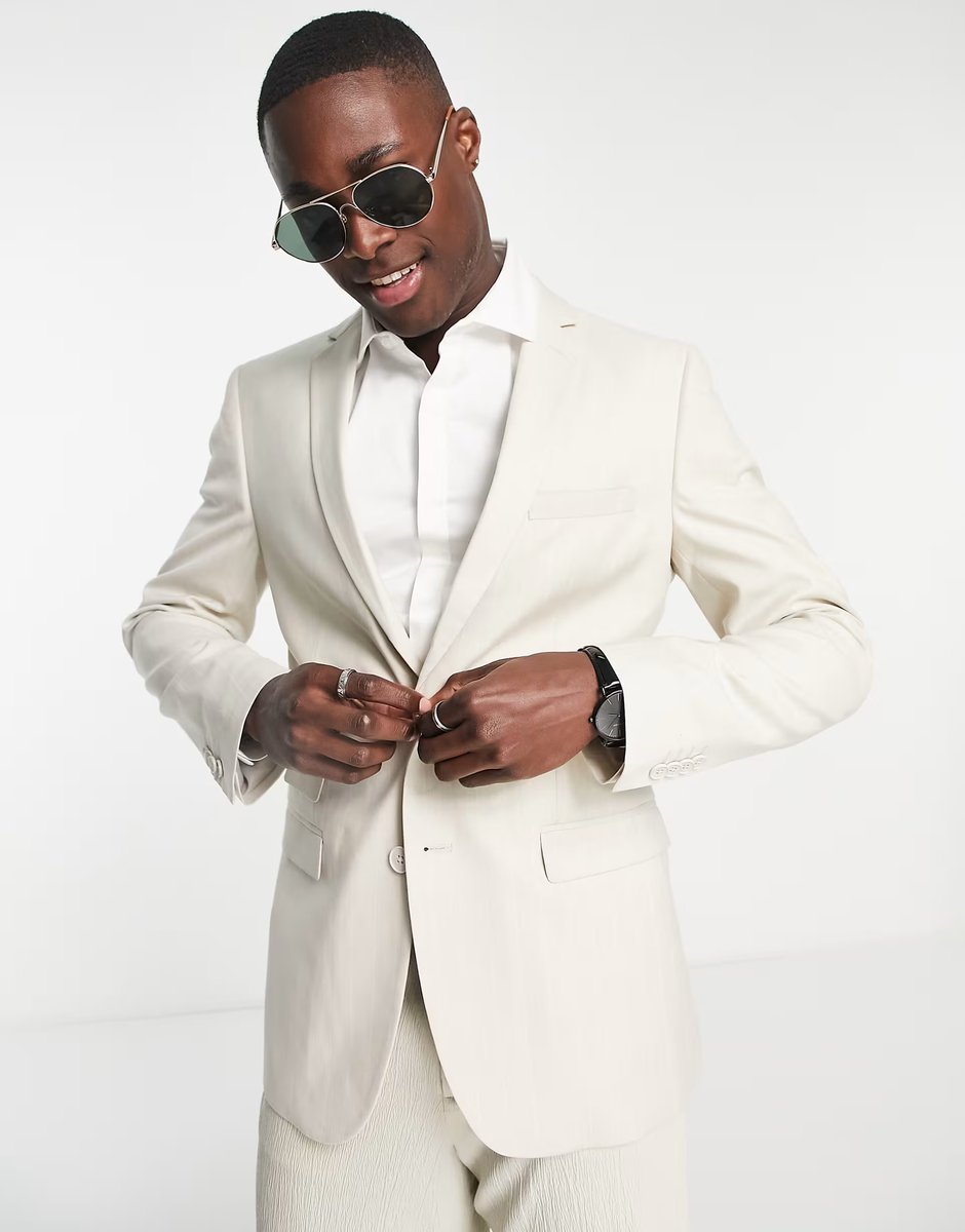 Stone and White Suit Jacket - perfect for a crisp, clean look for work or formal events. Designed with stone and white, peak lapel, button front, regular fit, suiting fabric. Features classic, professional style for a versatile look.