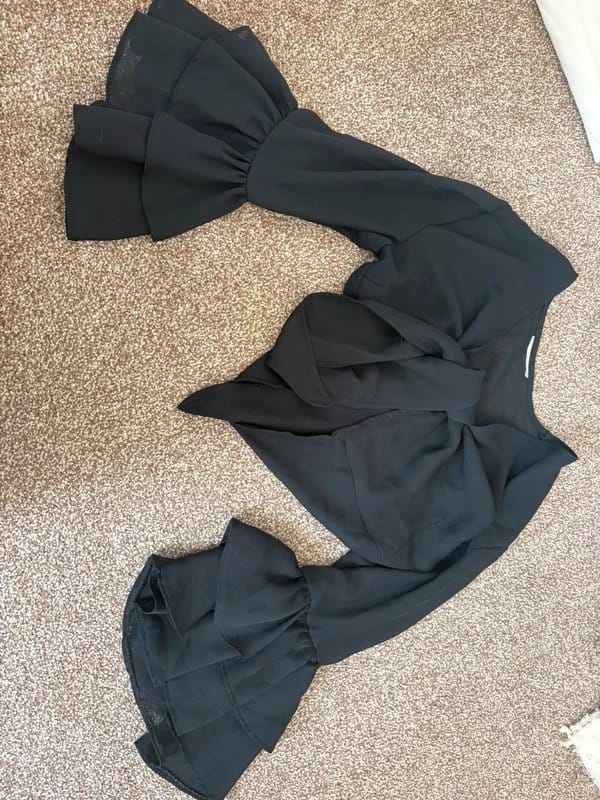 This black chiffon crop top features a tie-front design and frilly arms. Perfect for a casual yet chic look, this top is ideal for summer outings or layering under jackets.