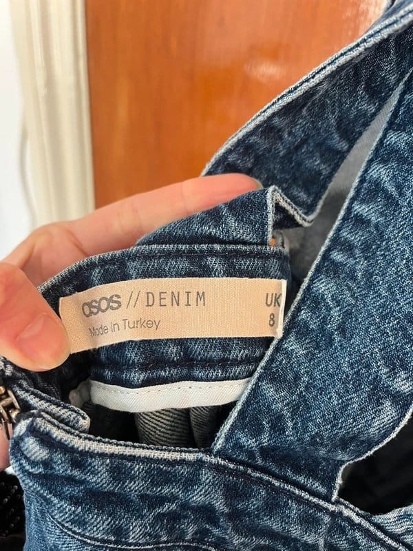 This blue denim jumpsuit by ASOS features a strappy back design and a cross strap for a flattering fit. Made from durable denim, it's perfect for casual outings.