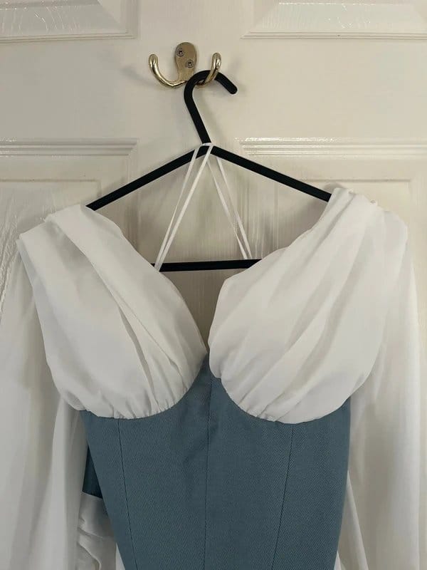 This ASOS LUXE dress features a stunning off-shoulder neckline and a two-tone blue and white colour scheme. Made from lightweight chiffon, it offers a flowing and elegant silhouette. Perfect for special occasions or evening events.