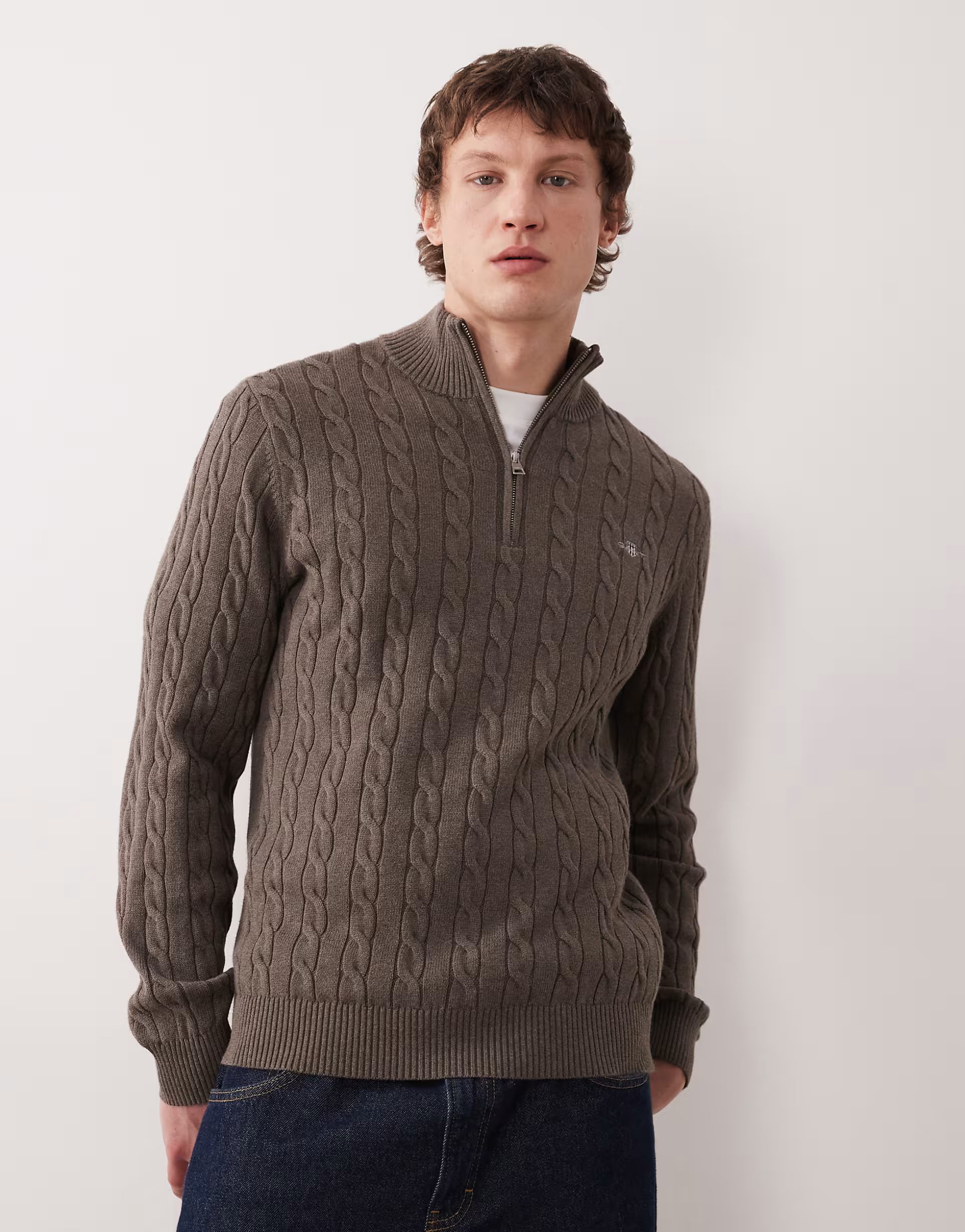 The ASOS Gant Cable Knit 3/4 Zip Jumper in Brown is available in sizes XXXL, XXL, XL, XS, L, M, S.