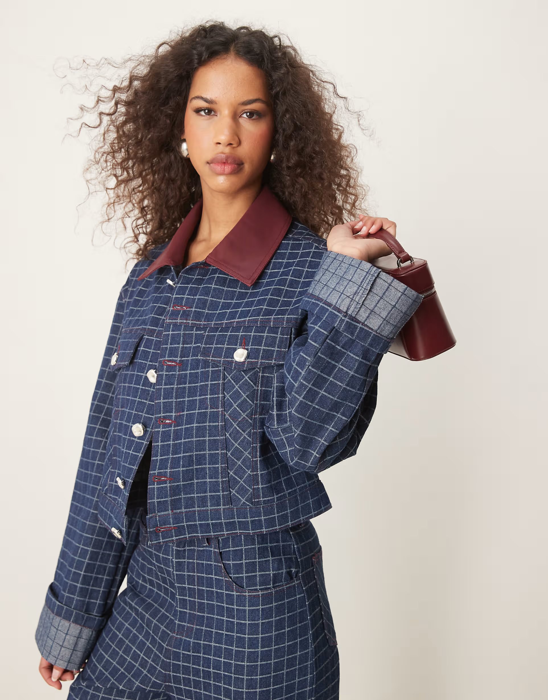 Designed with a contrast PU collar and a check pattern, this denim jacket co-ord adds a touch of edge to your wardrobe. Perfect for casual outings.
