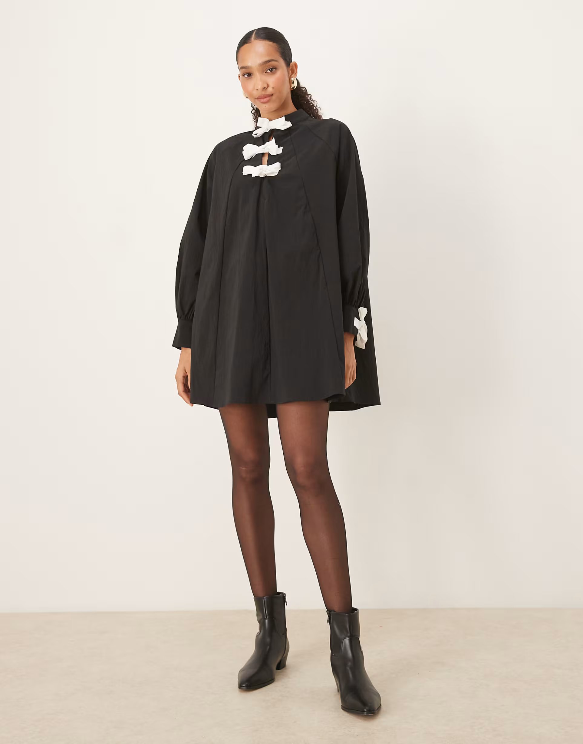 The ASOS Ghospell Swing Mini Dress with Bow Detail in Black is made from polyester.