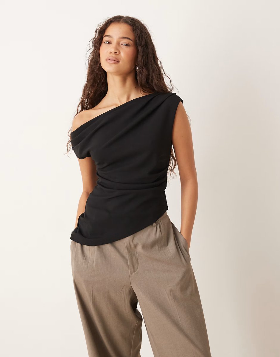 A sleek black asymmetric top from Gina Tricot, designed for a modern, edgy look. The top features a ruched one-shoulder design that adds a touch of drama to your outfit. Made from a stretchy fabric, it offers a comfortable fit and a stylish silhouette. Ideal for pairing with high-waisted trousers or skirts for a polished, party-ready ensemble.