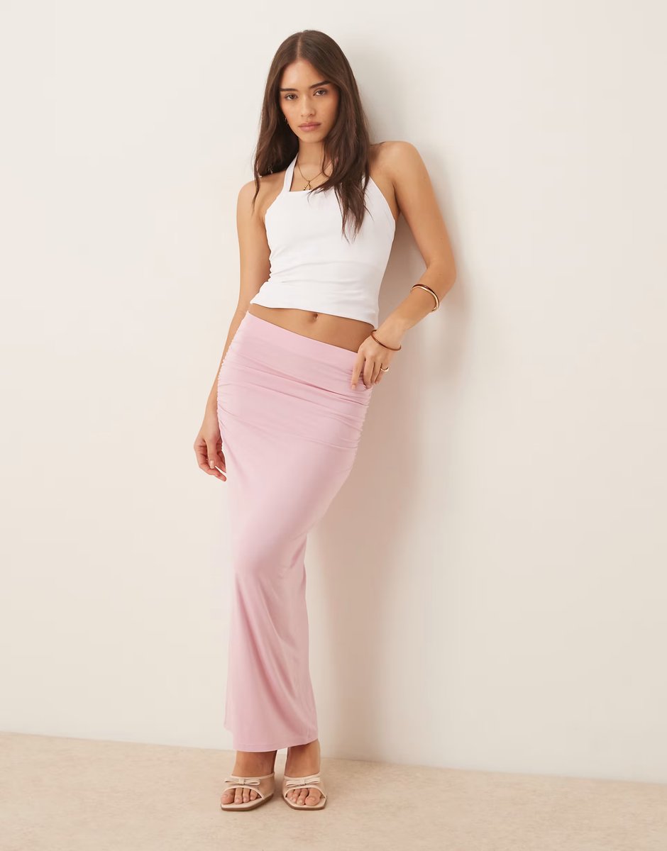 The ASOS Gina Tricot Pink Ruche Maxi Skirt with Soft Touch Jersey is ideal for casual, evening.