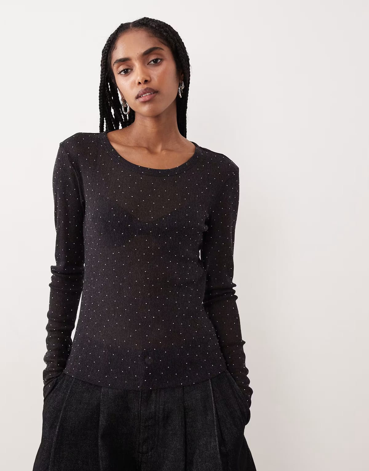 The ASOS Gina Tricot Long Sleeve Rhinestone Sheer Top in Black is ideal for party.