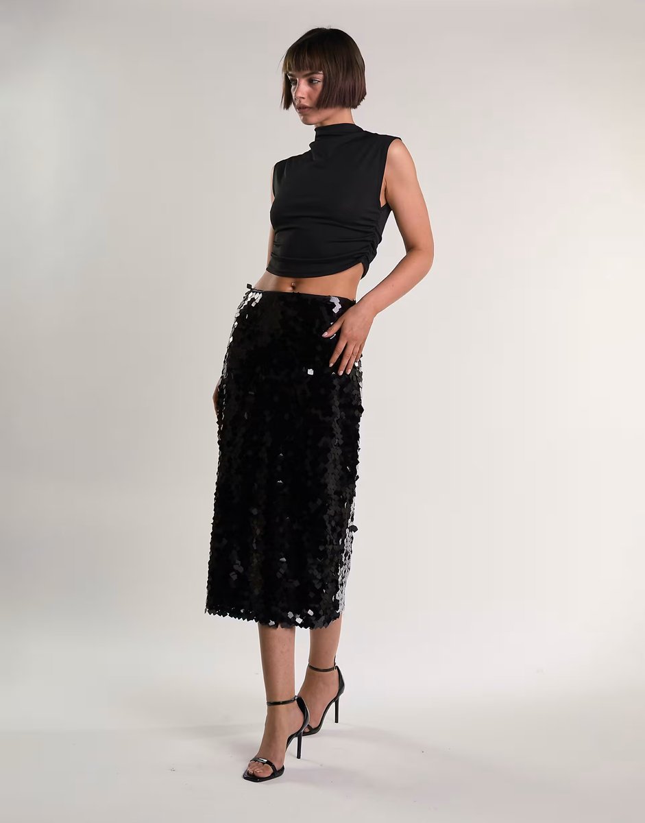 The ASOS Glamorous High-waisted Midi Skirt in Black Sequin is available in sizes XXXL, XXL, XL, XS, L, M, S.