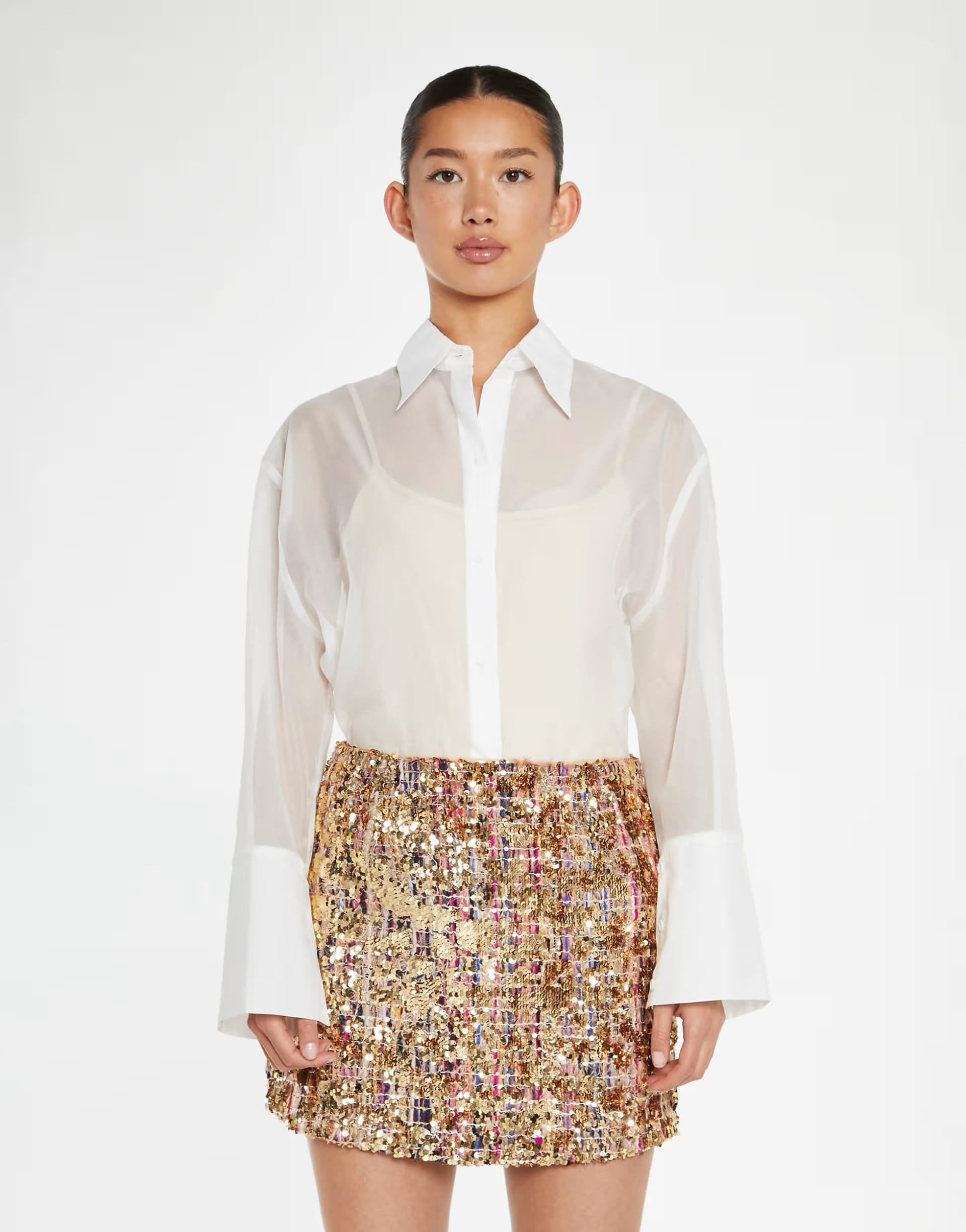 “Pair with a white blouse and gold high heels for a glamorous evening look.”