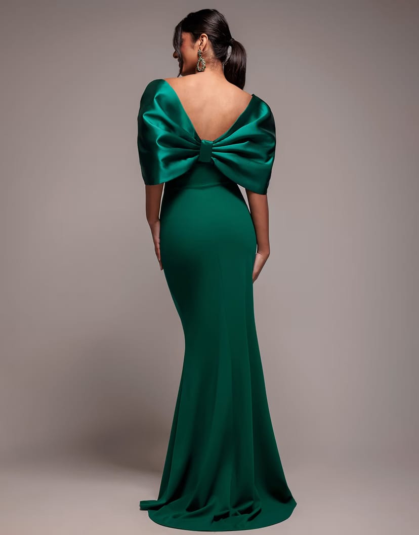 This emerald satin maxi dress by ASOS features an off-shoulder neckline with a dramatic bow at the back. The fitted bodice and flowing skirt create a flattering silhouette. Ideal for evening events or special occasions.