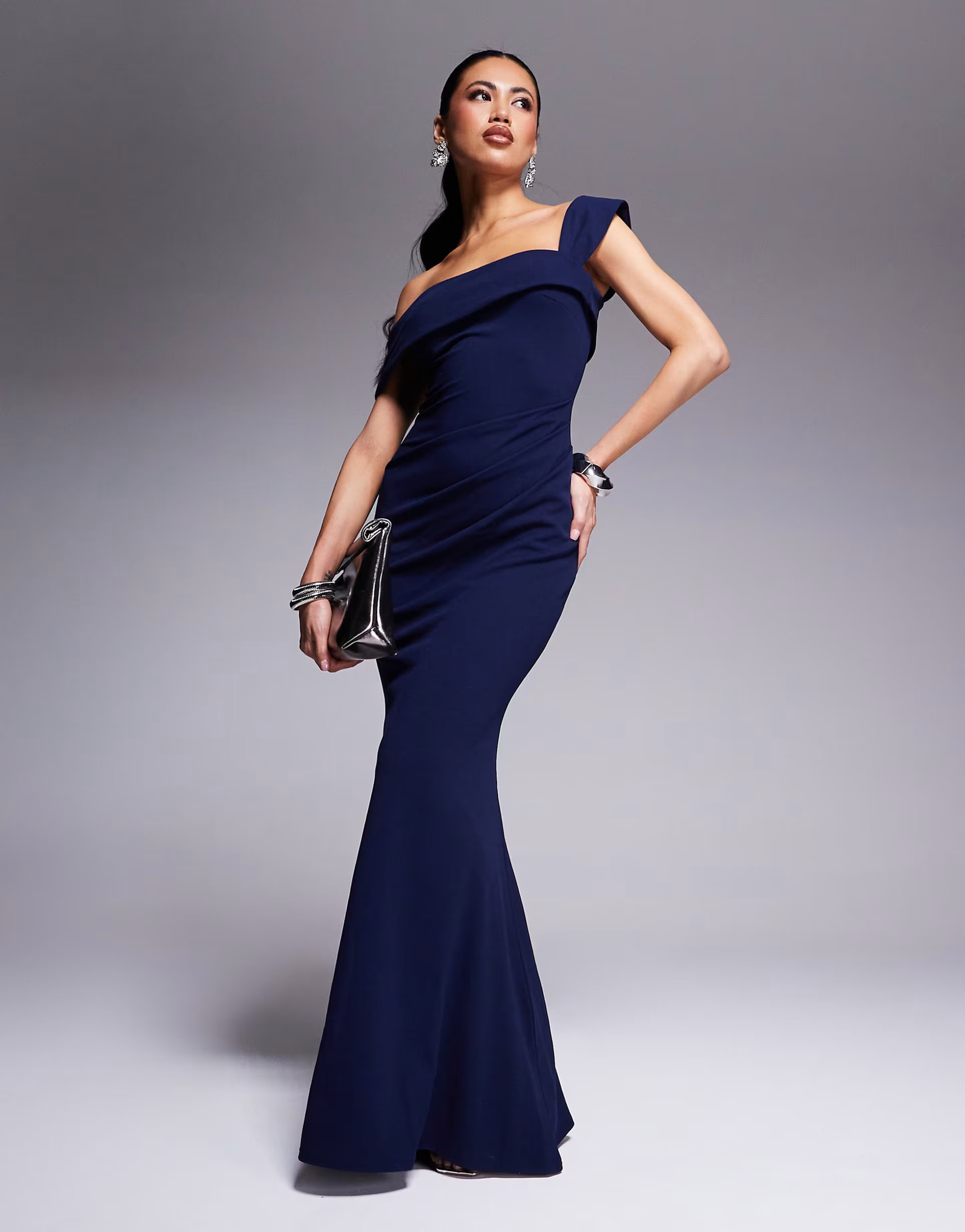 The ASOS Goddiva Off-Shoulder Pleated Maxi Dress in Navy is available in sizes XXXL, XXL, XL, XS, L, M, S.
