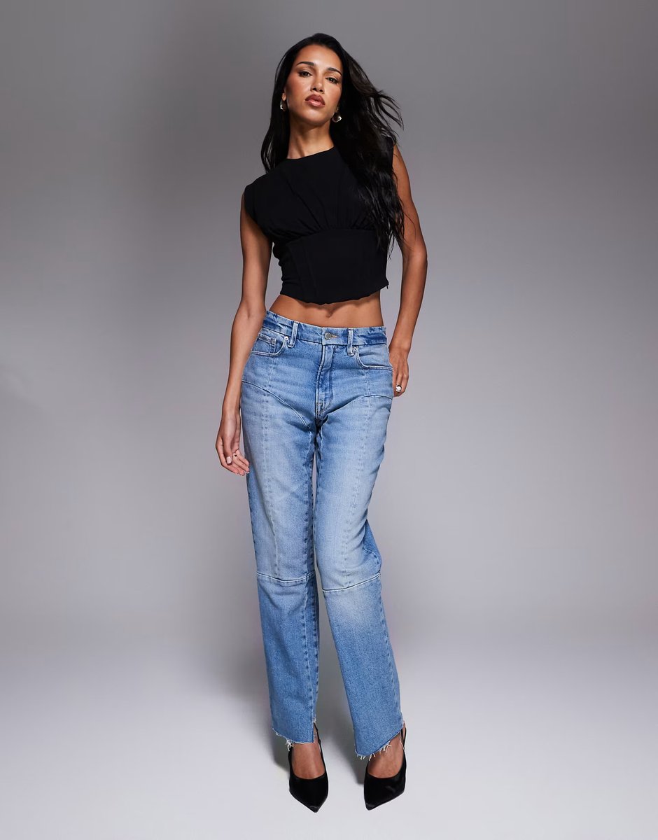 The ASOS Good American Icon Straight Jeans in Mid Blue Wash is available in sizes XXXL, XXL, XL, XS, L, M, S.