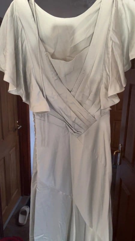 A stunning maxi dress in mint satin by ASOS. This elegant piece features a V-neckline with ruffled detailing and a wrap-around bodice for a flattering fit. Ideal for bridal showers and party occasions.